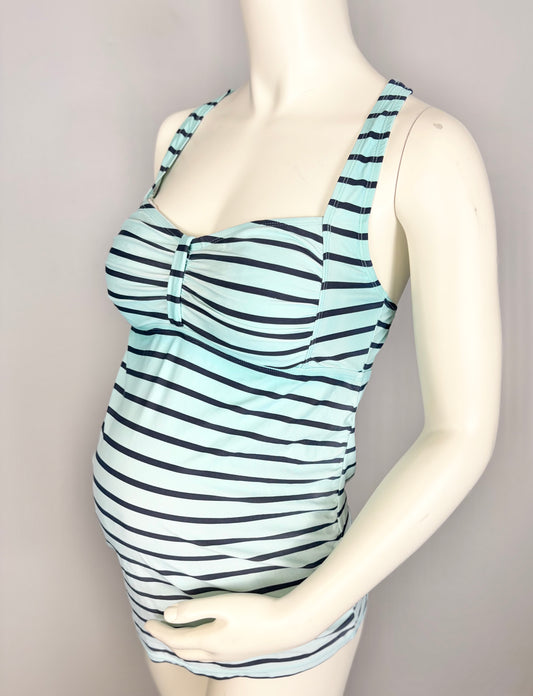 L - Motherhood Beach Bump Teal Striped 2-Piece Swim Set