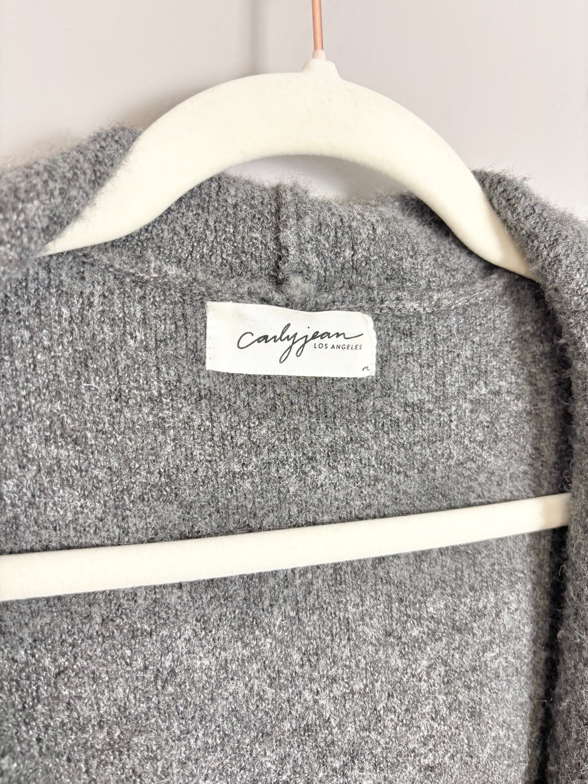 Sweater has a lovely weight and stretch and nice deep pockets. Comes with tie (not attached). VERY roomy and oversized fit makes it feel a lot larger than size M.